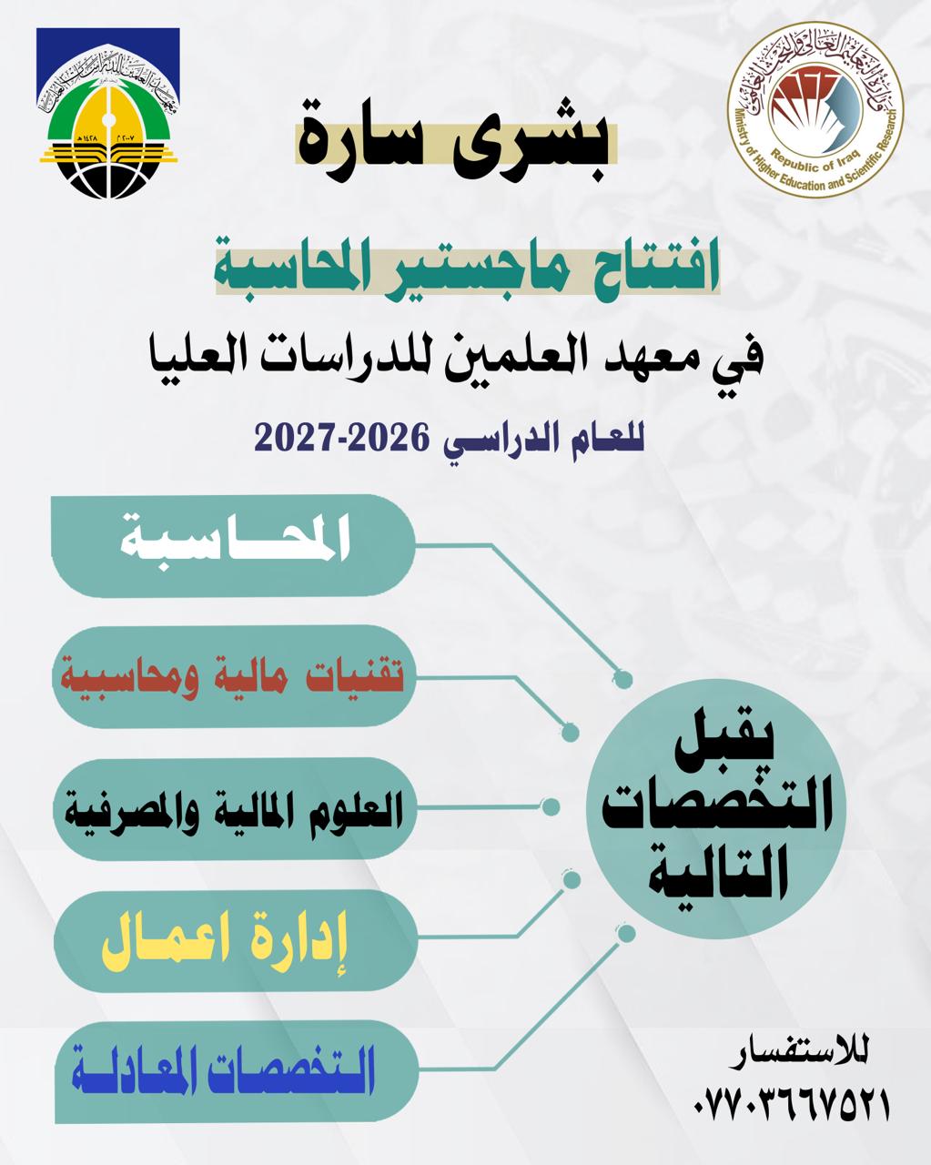 معهد علمي متخصص في الدراسات العليا، الماجستير والدكتوراه في القانون والعلوم السياسية، والماجستير في الاعلام، والدبلوم العالي في الانتخابات والحكم الرشيد.. يسعى معهد العلمين للدراسات العليا، الى احداث تطور كمي ونوعي في الحركة العلمية والثقافية والتربوية والبحث العلمي، من خلال اعداد كوادر علمية مستنيرة في الاختصاصات القانونية والسياسية والإعلامية، وفق رؤى علمية عصرية، لخلق جيل يمتلك امكانية البناء العلمي، وطرح رؤى معاصرة، ودعم الحركة البحثية والأكاديمية من خلال طبع الرسائل الجامعية بمختلف المجالات، واقامة الندوات والمؤتمرات العلمية، وتبنى المشاريع البحثية الوطنية.