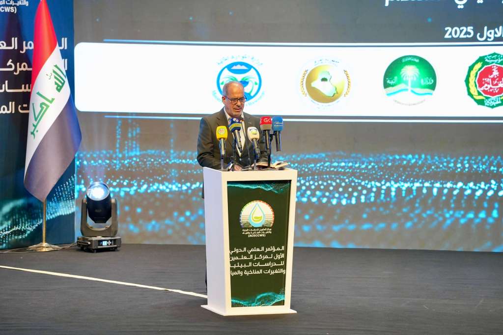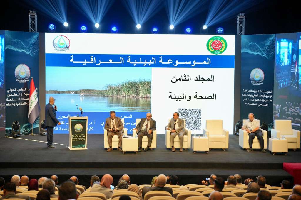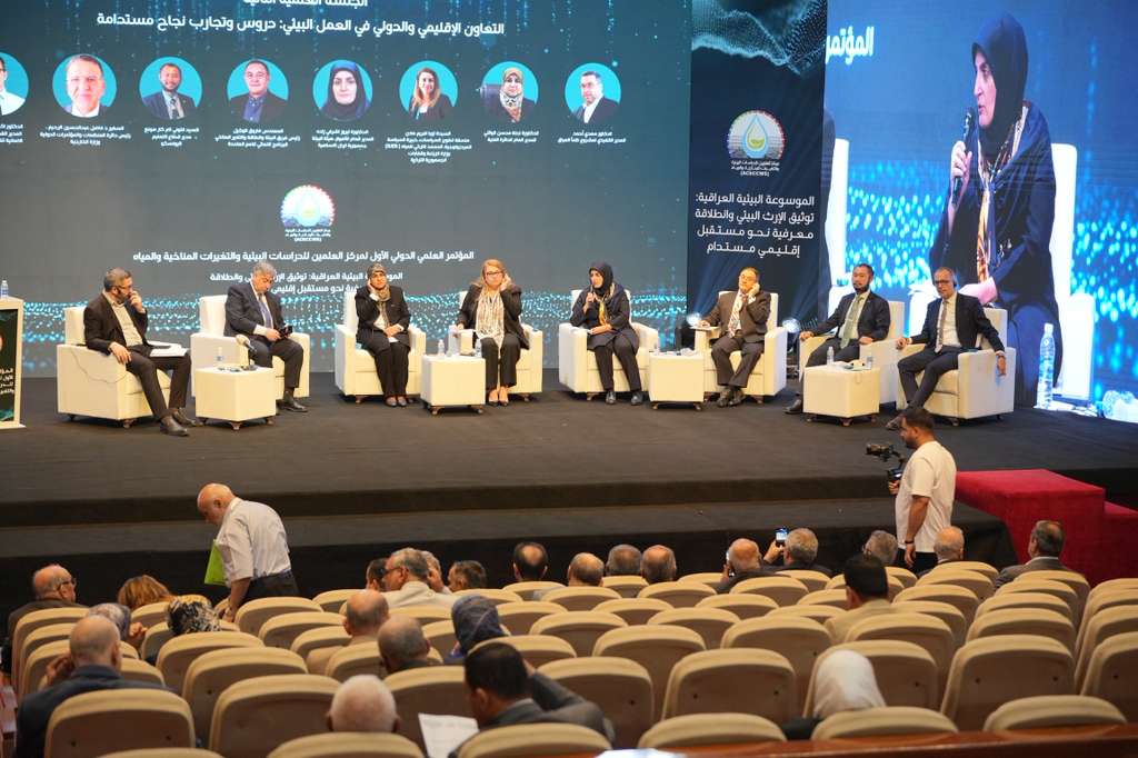 برعاية دولة رئيس الوزراء المهندس محمد شياع السوداني، وبحضور وزير البيئة ومحافظ البنك المركزي، اختتمت في بغداد السبت ١٨ تشرين الاول ٢٠٢٥، اعمال " المؤتمر العلمي الدولي الأول لمركز العلمين للبيئة والتغيرات المناخية والمياه" تحت شعار " الموسوعة البيئية العراقية: توثيق الإرث البيئي وانطلاقة معرفية نحو مستقبل إقليمي مستدام" ، وناقش المؤتمر، خلال يومين، وعبر سبعة جلسات علمية تخصصية ، وبحضور الممثل الخاص للأمين العام للأمم المتحدة والمنسق المقيم للعراق السيد غلام إسحاق زاي، والسفيرين الإيراني والتركي في بغداد بصحبة وفود بحثية واكاديمية من البلدين، والمدير العام للمركز العربي لدراسات المناطق الجافة والأراضي القاحلة الدكتور نصر الدين العبيد، وممثلين عن وزارات الخارجية والتخطيط والبيئة والموارد المائية والصحة والزراعة وهيئة الاعلام والاتصالات ومكتب البيئة والتغير المناخي في هيئة المستشارين، وعدد كبير من الخبراء والاكاديميين من داخل العراق وخارجه، تعزيز الشراكة العلمية بين العراق ودول الجوار للقضاء على الظواهر الناجمة عن الاحتباس الحراري وشح المياه، وهجرة السكان ودعم الجهود الحكومية والأكاديمية لمواجهة تحديات البيئة وارتدادات التغير المناخي، لخدمة التنمية المستدامة، فضلاً عن صياغة جهود الخبراء في مبادرات قابلة للتطبيق. الممثل الخاص للأمين العام للأمم المتحدة والمنسق المقيم للعراق السيد غلام إسحاق زاي، والسفيرين الإيراني والتركي في بغداد بصحبة وفود بحثية واكاديمية من البلدين،