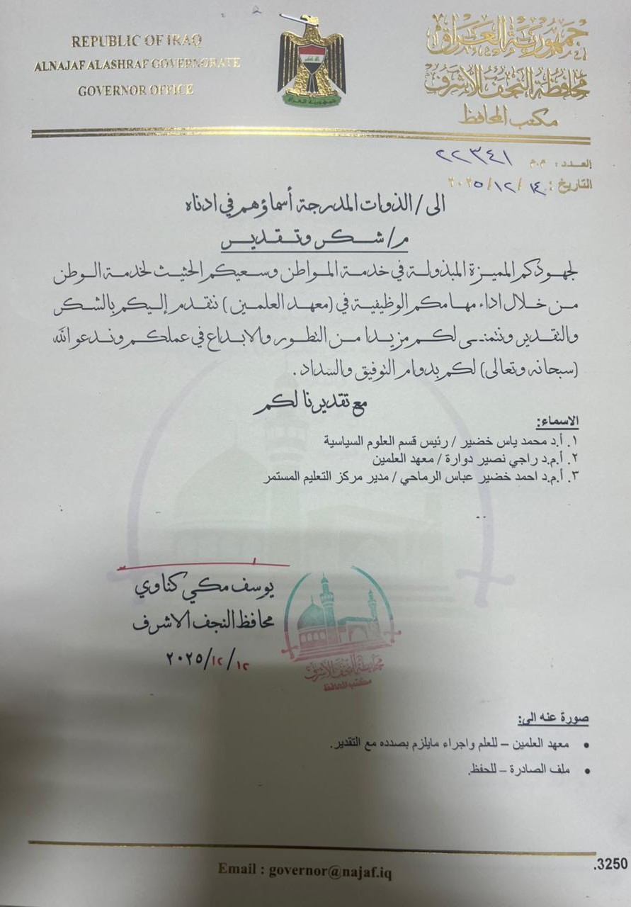 وجه محافظ النجف الاشرف المهندس يوسف مكي كناوي، الاحد 14 كانون الثاني 2025، كتاب شكر وتقدير الى أ.د محمد ياس خضير رئيس قسم العلوم السياسية بمعهد العلمين للدراسات العليا، وأ.م.د احمد خضير الرماحي مدير مركز العلمين للتعليم المستمر، وأ.م.د راجي نصير دواره مقرر قسم الاعلام في معهد العلمين، شاكرا لهم جهودهم المميزة والمبذولة لخدمة الوطن والمواطن من خلال جهودهم الاكاديمية في معهد العلمين، متمنيا لهم المزيد من التطور والعطاء.
