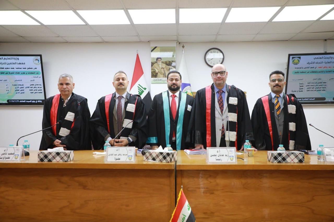 جرت في قسم القانون بمعهد العلمين للدراسات العليا، السبت ٢٩ تشرين الثاني 2025، مناقشة بحث الدبلوم الموسوم "دور الانتخابات في تعزيز المصالح المشتركة بين الحكومة الاتحادية والاقاليم والمحافظات غير المنتظمة بإقليم" للطالب "زيد رياض احمد" و ترأس لجنة المناقشة ا.د زيد عدنان محسن عميد معهد العلمين للدراسات العليا، وضمت لجنة المناقشة ا.د سرمد رياض عبدالهادي من وزارة التعليم العالي والبحث العلمي، و م.د حسين عباس حميد من كلية القانون جامعة الفراهيدي، وا.د صعب ناجي عبود رئيس قسم القانون العام بمعهد العلمين عضواً ومشرفاً، وبعد مناقشة مستفيضة تم إجازة البحث.