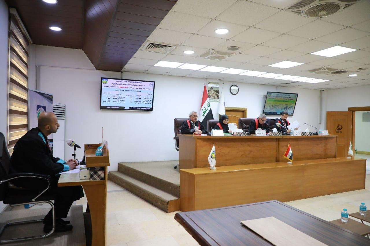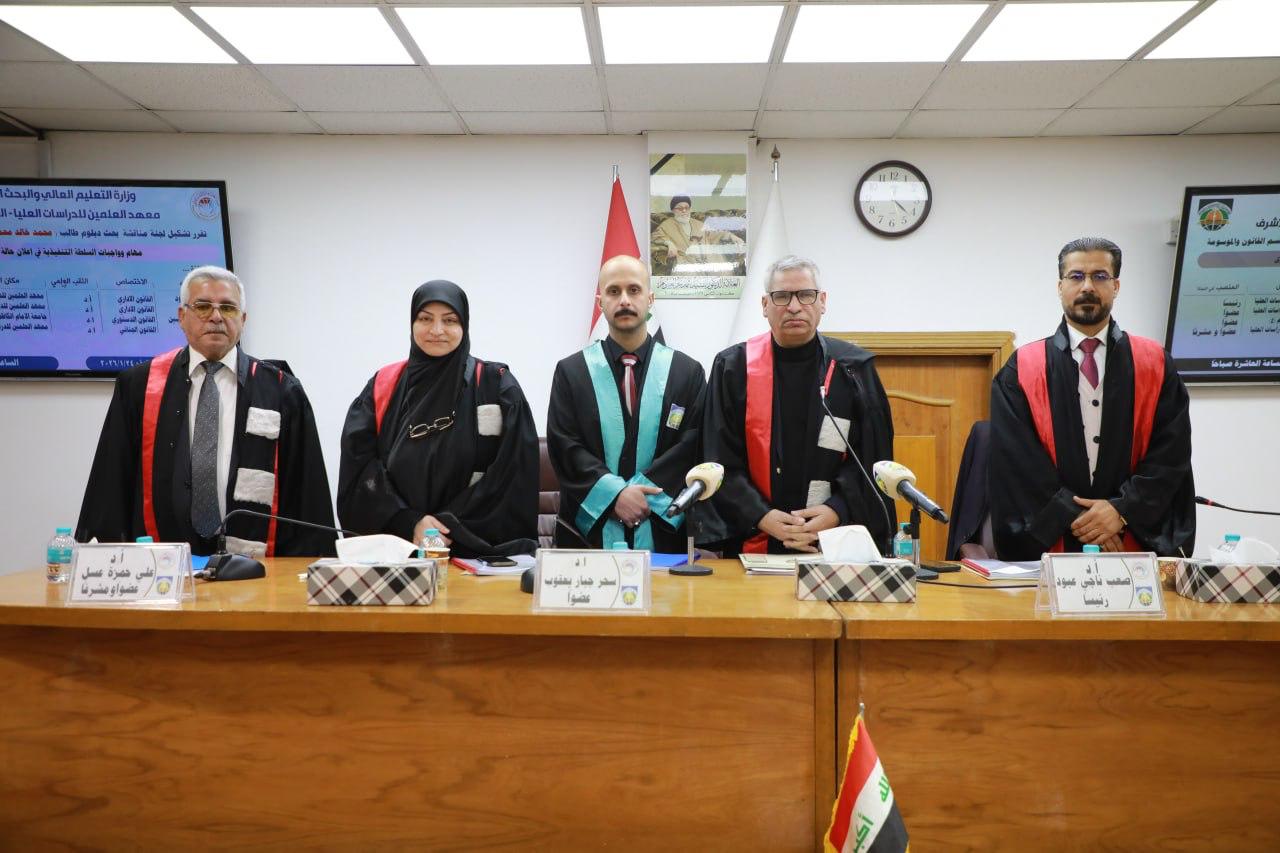 جرت في قسم القانون بمعهد العلمين للدراسات العليا، السبت ٢٤ كانون الثاني 2026، مناقشة بحث الدبلوم الموسوم " مهام وواجبات السلطة التنفيذية في اعلان حالة الطوارئ " للطالب "محمد خالد محمد" و ترأس لجنة المناقشة ا.د صعب ناجي عبود رئيس قسم القانون العام بمعهد العلمين، وضمت لجنة المناقشة ا.د سحر جبار يعقوب من معهد العلمين، وا.د مخلص محمود حسين من جامعة الامام الكاظم(ع)، و ا.د علي حمزة عسل من معهد العلمين عضواً ومشرفاً، وبعد مناقشة مستفيضة تم إجازة البحث.