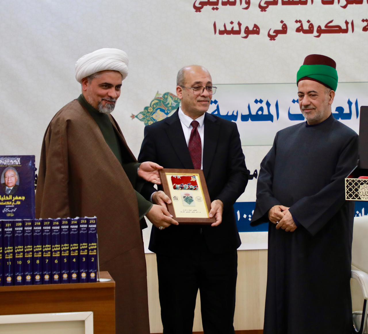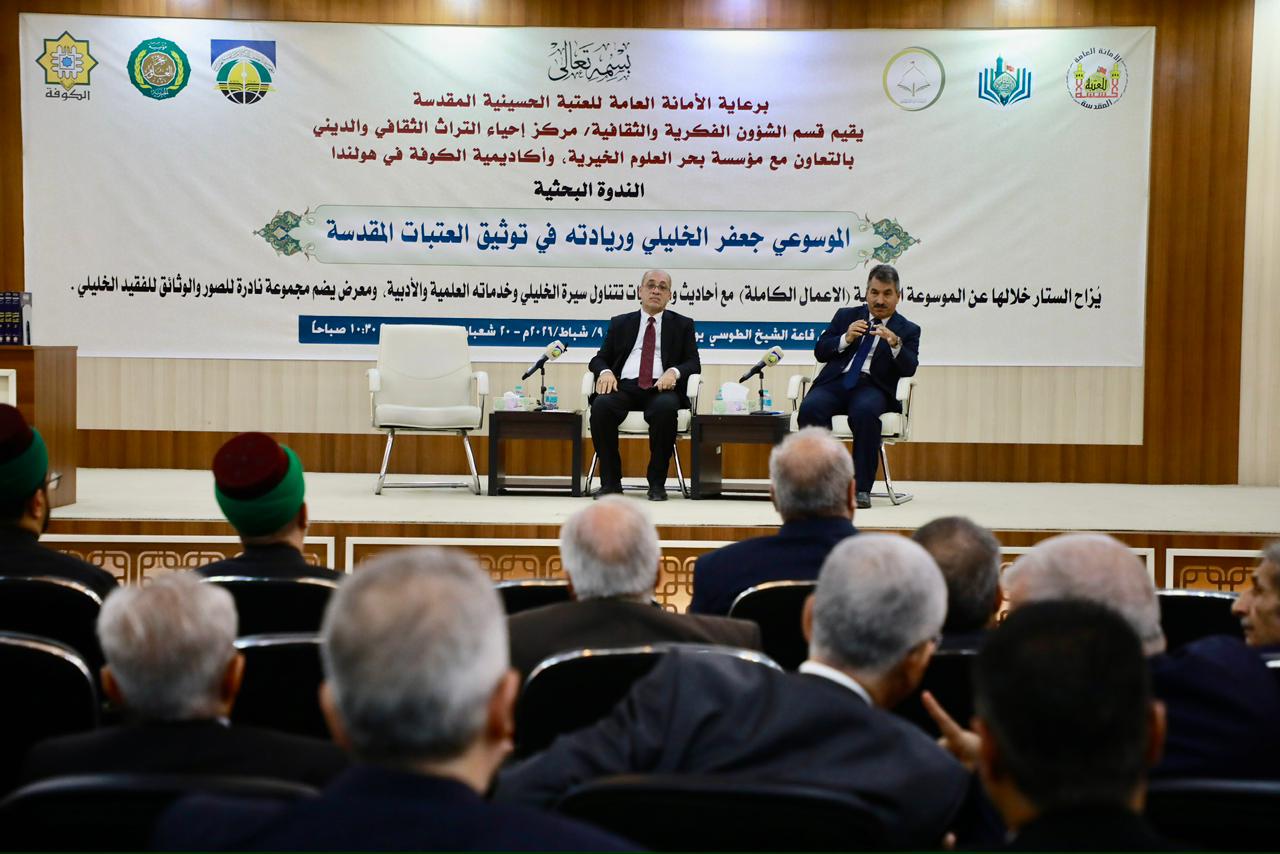 نظم مركز إحياء التراث الثقافي والديني التابع لقسم الشؤون الفكرية والثقافية في العتبة الحسينية المقدسة بالتعاون مع مؤسسة بحر العلوم الخيرية ومعهد العلمين للدراسات العليا، واكاديمية الكوفة في هولندا، الاثنين 9 شباط 2026، ندوة بحثية تحت عنوان " الموسوعي جعفر الخليلي وريادته في توثيق العتبات المقدسة"، على قاعة الشيخ الطوسي بمعهد العلمين، بحضور نائب الأمين العام  للعتبة الحسينية المقدسة السيد محمد علي بحر العلوم، ومعالي الدكتور إبراهيم بحر العلوم رئيس مؤسسة بحر العلوم الخيرية، والمهندس يوسف كناوي محافظ النجف، وعدد كبير من السادة العلماء وفضلاء الحوزة العلمية، والاكاديميين والباحثين وطلبة الدراسات العليا في معهد العلمين والمواطنين.